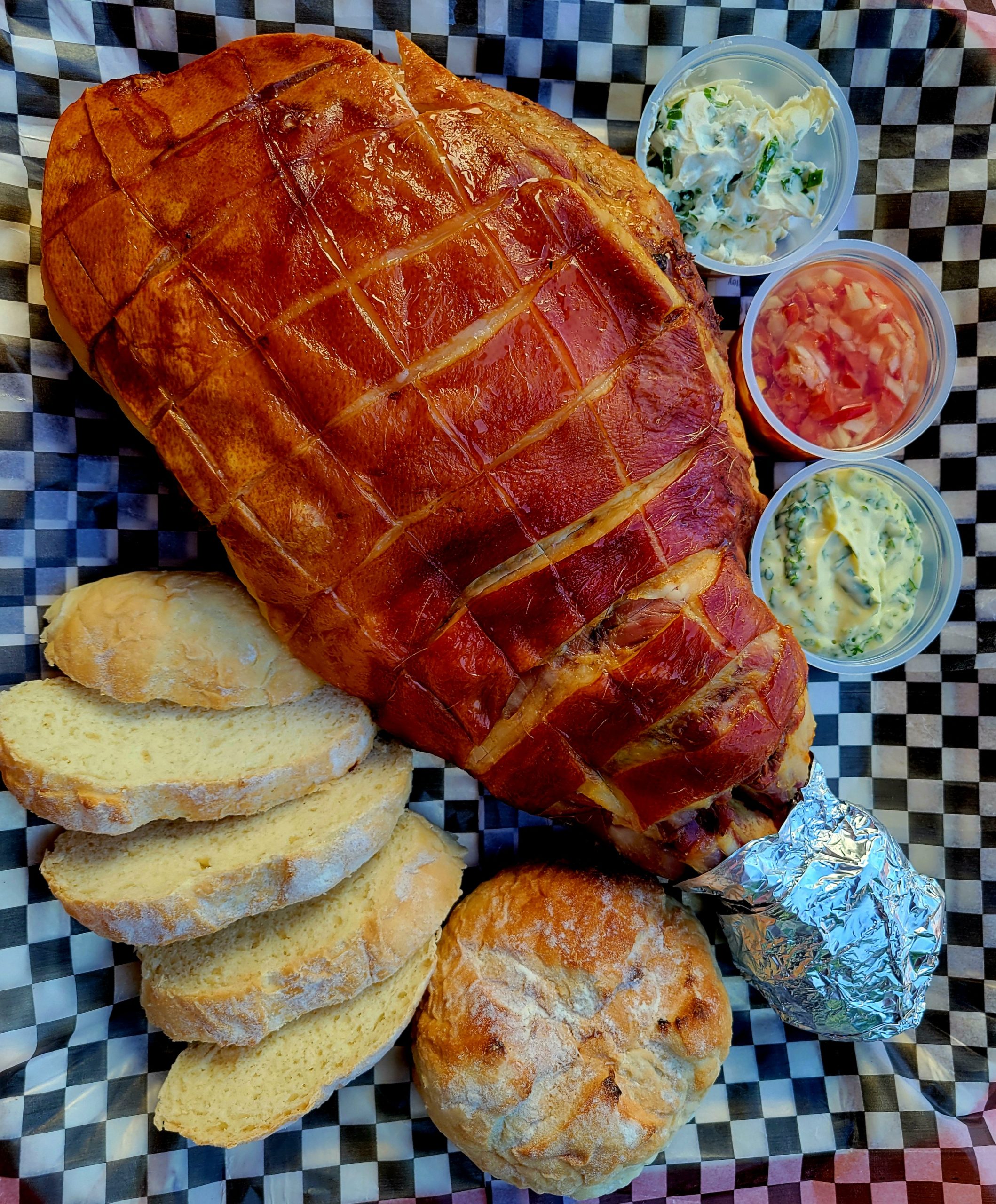 Pernil de cerdo grande con salsas y panes (Comen 30 personas / Pican 40 personas)